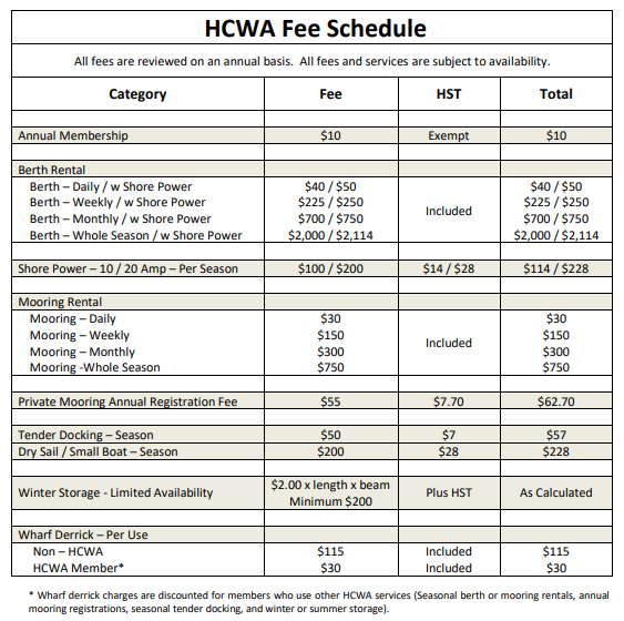 The HCWA has a very limited number of moorings available to rent for both short term and long term visits. The daily mooring rental fee is $30.